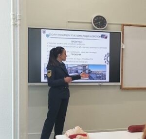 Η παρουσίαση, η οποία διήρκεσε δύο διδακτικές ώρες και απευθυνόταν σε δύο ομάδες μαθητών και μαθητριών της Γ΄ Λυκείου, πραγματοποιήθηκε από την Αρχισμηνία Δήμητρα Καψή και τον Υποσμηναγό Ευθύμη Χατζηευθυμίου.